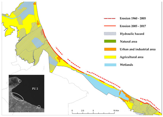 Figure 5a does not highlight significant risk situations, reaching medium and low values, if compared to the risk levels observed in the most stressed coastal areas in Europe (e.g., [11]) and in the Northern Adriatic Sea in Italy (e.g., [7,17,55]). However, about 27% of the regional coastline presents a medium risk level. Two coastal hot spots are highlighted in the Gulf of Manfredonia (PU2), where the predominant risk factors are essentially due to the coastal type, characterized by long sandy coastlines and low inland heights, the erosion rates and the presence of high ecological value areas. Other critical areas can be detected in the regional coastline, especially the major cities and the most known touristic areas where coastal exposure has larger values. In Figure 5b the normalized risk indicator (nRI) derived from the Mod.E.M. is mapped for the regional coastline, using the present-day values. The comparison between the two models (Figure 5a,b) shows that both the new indicators and data-sets considered in the present work affect RI calculation. With reference to Mod.E.M. results, an increase of risk level can be observed, mainly due to the indicator and seasonal tourist population considered in , since they increase both CVI and CEI. Almost 25% of the municipalities are affected by river flooding in the coastal area and these events cannot be overlooked since heavy rainfalls are increasingly driven by changing climate [2]. This aspect can be better appreciated by looking at Figure 6, where land cover, shoreline erosion and river flooding areas are mapped in a region within PU2. The highlighted area is chosen because it contains several important aspects: (i) it has been heavily affected by erosion since the second half of the 20th century and the shoreline retreat is currently ongoing, (ii) a large part of that area is covered by the largest saltworks in Europe and it is classified as a protected natural area and (iii) wide flood-prone areas have been identified by [52]. In such a context the EUrosion procedures highly underestimate the coastal vulnerability and exposure.