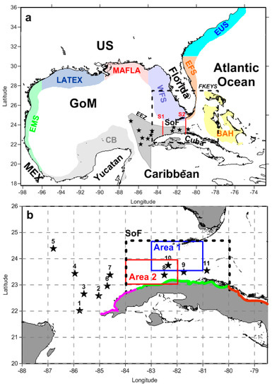 (a) The Gulf of Mexico (GoM) domain of the GoM-HYCOM 1/50 simulations with the main geographical areas (United States: US; Mexico: MEX; Gulf of Mexico: GoM; Straits of Florida: SoF; Florida; Yucatan; Cuba), the adjacent seas (Atlantic Ocean and Caribbean Sea) and the respective major continental shelves (Eastern Mexico Shelf: EMS; Louisiana and Texas Shelf: LATEX; Mississippi, Alabama, and Florida Shelf: MAFLA; Western Florida Shelf: WFS; Campeche Bank: CB; Eastern Florida Shelf: EFS; Eastern US Shelf: EUS; Bahamas Shelf: BAH) as defined by the 200 m isobath. The grey shaded area around western Cuba represents the Petroleum leasing concession area [4]. The dashed black box indicates the domain of the FKEYS-HYCOM 1/100 simulations. (b) The star symbols mark the 11 locations of the potential oil exploration sites used in the study, the blue (Area 1) and red (Area 2) boxes indicate the regions of cyclonic and anticyclonic activity inside the SoF (dashed black box) and the red lines in (a) mark Sections S1 and S2. The northern Cuban coast is divided into three parts (Magenta: West of 83.5° W, Green: 83.5–80° W, and Brown: East of 80° W).