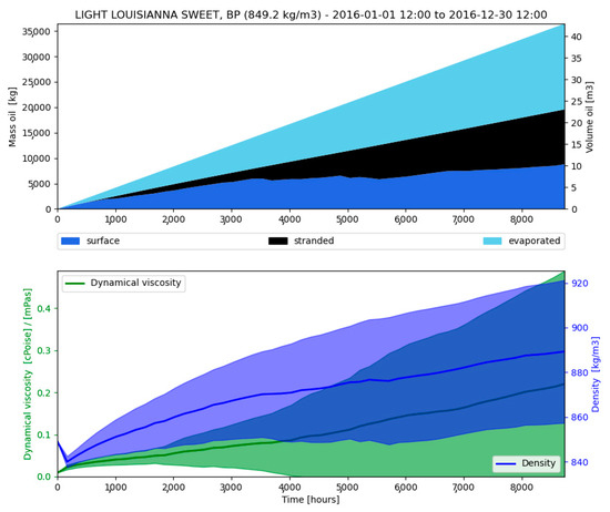 Mass balance of one year (2016) simulation for Point 5 (upper panel) and the corresponding average and spread of oil mass density and viscosity (lower panel). Each oil element represents 1 kg of oil in this case and 100 elements are seeded per day.