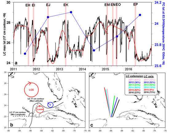 The variability of the LC extension together with the major LCE shedding events during the 2011–2016 period are presented in Figure 3a. The LC variability is characterized by long extended phases in 2011, 2014, and 2015, while periods of retracted LC over the southeastern Gulf were mainly observed in 2012, 2013, and 2016. The mean annual axis of the LC, defined between the base of the LC in the Yucatan Channel (LC 17 cm contour along 22° N; Figure 3b) and its mean annual maximum latitude (Figure 3b), is used as a proxy for the overall annual position of the LC (Figure 3c). In addition, the “young” LC phases corresponded to the extended FC at the entrance of the Straits of Florida (Section S1; Figure 1a); during the retracted phases in 2012, 2013, and 2016, large LC axis angles (Figure 3c) and higher latitudes of the FC position along 83.5° W (>24° N; Figure 3a) were computed, in comparison to 2011, 2014, and 2015, when the FC evolved closer to the Cuban coast (<24° N; Figure 3a).