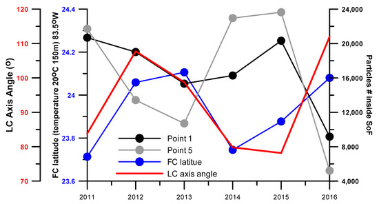 Annual means of the Florida Current (FC; blue line) latitude as derived from the location of the 20 °C temperature contour line at 150 m along the 83.5° W meridian (Section S1, Figure 1a), annual mean values of the Loop Current (LC) axis angle (red line; described in Figure 3) and the total number of oil elements detected inside the Straits of Florida (dashed box in Figure 1b) released at Point 1 (black line) and Point 5 (grey line); see Figure 1b for the location of release points.