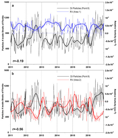We now focus on the mesoscale dynamics that control the oil pathways inside the Straits of Florida, such as the FC and the accompanying anticyclonic and cyclonic eddies. The presence of such eddies, based on the RV variability, was evaluated for the 2011–2016 study period with respect to the FC variation and the respective effects on the presence of oil released from Point 8 (Figure 11), located at the south-central area of the Straits (Figure 1b). Cyclonic eddies usually cover the Straits region north of the FC (marked as Area 1 in Figure 1b) and contribute to the retraction of the FC away from the WFS and closer to the Cuban coast [37]. CubANs evolve along the northwestern coast of Cuba (marked as Area 2 in Figure 1b) extending the FC towards the northern Straits [34,35]. The cyclonic activity associated with a high positive RV in Area 1 coincides with periods of weak oil presence inside the Straits (Figure 11a). A large number of oil elements, released at Point 8, was identified in the Straits during the periods with small positive RV values and absence of cyclones (e.g., 2012). The impact of the anticyclonic activity, computed in Area 2, is described in Figure 11b. Here, contrary to the cyclonic activity, the presence of anticyclonic eddies (high negative RV values) coincides with the large number of oil elements inside the Straits. Kourafalou et al. [34], based on satellite data and numerical simulations, showed that the highest occurrence frequency of CubAN eddies was observed in 2016 (more than 80% of the year) as derived from data of a long period of 13 years (2004–2016). Especially in 2016, the number of oil elements was increased during the entire year, while the RV is characterized by a very long period of high negative values. The LC axis showed its highest mean annual values in 2012 and 2016 (Figure 10), associated with periods of retracted LC and high occurrence frequency of CubAN anticyclones. The entrapment of oil elements inside these anticyclones is apparent both in 2012 and 2016 (strong anticyclonic activity and high number of elements; Figure 11b) is also apparent in the oil density maps presented in Figure 7, where oil elements spread even at the western area of Point 8 (see Section 3.2). The relatively high Pearson coefficient [51] between the anticyclonic RV and the number of oil elements (r = −0.56) confirms the good correlation between the two variables. The formation of anticyclonic eddies, which is also related to the LC axis position, is also a good indicator for the oil fate and presence inside the Straits of Florida.