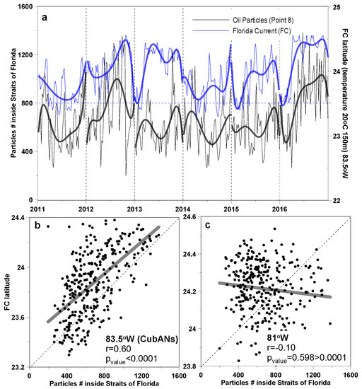 (a) Time series of weekly number of oil elements (black line) that were released at Point 8 and computed inside the Straits of Florida (dashed box in Figure 1b) overlaid with the respective Florida Current (FC) latitude, derived as the location of the 20 °C temperature contour line at 150 m along 83.5° W (Section S1). The respective annual polynomial fit (5th order) for each time series is indicated with a solid line. Scatter diagrams between the element number and the FC latitude are shown along (b) 83.5° W (Section S1) and (c) 81° W (Section S2) meridians. The linear fits (thick grey line), the Pearson correlation coefficients r, and the pvalue are also presented in (b,c). See Figure 1a for the positions of Sections S1 and S2 and Figure 1b for the position of Point 8.
