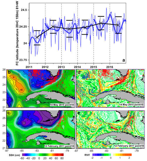 (a) Weekly position (thin blue line) of the Florida Current (FC) derived from the latitude of the 20 °C isotherm at 150 m along 81° W (Section S2; Figure 1a). The annual polynomial fit (5th order; thick blue line), the annual mean (marked with X), and the 1st and 3rd quartiles of each year are included. Sea Surface Height (SSH; cm) on (b) 14 May, 2015 and (c) 12 February, 2011. Surface Relative Vorticity (RV) normalized with the Coriolis frequency on (d) 14 May, 2015 and (e) 12 February, 2011. The locations of oil elements (red dots), released at Point 10 (red star), are also overlaid.