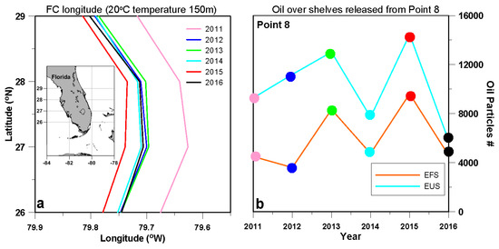 (a) Florida Current (FC) longitude, as derived from the 20 °C temperature contour line at 150 m along 26, 27, 28, and 29° N in the Atlantic Ocean (map in the insert) and averaged for each year during the 2011–2016 period. (b) Annual number of oil elements released at Point 8 (Figure 1b) detected inside the Eastern Florida Shelf (EFS; orange line) and Eastern US (EUS; blue line). The dot color in (b) represents the respective year presented in (a).