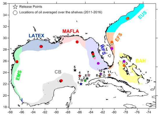 Mean location (2011–2016) of all oil elements that passed over each shelf region derived by averaging the coordinates of these elements within its shelf area. Only the shelf regions for which the number of oil elements that reached them was larger than 25,000 are plotted. Each release point is indicated by a different color (colors match the release points marked as star symbols; Point 1: Blue, Point 2: Light green, Point 3: Grey, Point 4: Red, Point 5: Black, Point 6: Dark green, Point 7: Purple, Point 8: Brown, Point 9: White, Point 10: Magenta, Point 11: Orange). The continental shelf areas, delimited by the 200 m isobath, are presented (Eastern Mexico Shelf: EMS; Louisiana and Texas Shelf: LATEX; Mississippi, Alabama, and Florida Shelf: MAFLA; Western Florida Shelf: WFS; Campeche Bank: CB; Eastern Florida Shelf: EFS; Eastern US Shelf: EUS; Bahamas Shelf: BAH). Note that certain positions represent overlapping mean locations with more than one release points (see Figure 16 and text for details).
