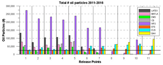 The mean location of the oil elements released from all potential exploration sites during the entire study period (2011–2016) is presented in Figure 15 for all the shelf study areas. We show only the location of elements with a total number greater than 25,000 (the sum of oil elements “detected” over the shelf) during the six-year period (Figure 16). The oil detected over the shelf areas from the southwestern to the northern GoM (CB, EMS, LATEX, MAFLA) is localized over a relatively small region, regardless of the release point. The connectivity of these remote regions with the Cuban EEZ is mainly based on the LC system variability. The highest number of elements over the EMS (in green) was related to oil that originated from Points 1, 3, 4, and 5 (Figure 16) and is usually aligned over the northward bound (western boundary) of the LC, as presented in Section 3.1. The release of oil at these four sites led to a large number of oil elements (>100,000; Figure 16) over the central LATEX (~93° W); the release from the eastern part of the Straits (e.g., Point 11) revealed a very low number of elements (Figure 16) over all continental shelves in the GoM (CB, EMS, MAFLA, LATEX, and WFS). Only the release from the north-central Straits of Florida (Point 10) affected the concentration of oil over the southern WFS shelf (Figure 15) under processes discussed in Section 4.1. The mean concentration area of the MAFLA shelf is located away from the Mississippi River Delta, along the shelf-slope of the northeastern GoM (~86° W; Figure 15). Conversely, the mean concentration on the LATEX shelf is detected at the center of the shelf (~28° N) and closer to the Atchafalaya outflow and Mississippi Delta (~92° W; Figure 15). This is connected to the prevailing buoyancy-driven flows around the Mississippi Delta that are northeastward with an offshore transport tendency in MAFLA, while westward with an onshore transport tendency in LATEX [54,55,56].