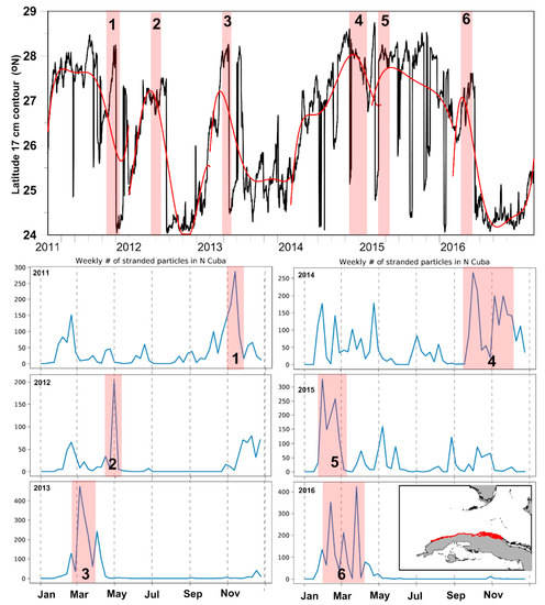 Daily evolution of the maximum latitude (°N) of the Loop Current (LC) defined by the 17 cm Sea Surface Height (SSH) contour (upper panel). The red line indicates the 5th order annual polynomial fit of the LC time series. The red shaded boxes indicate the six periods with an extended LC and increased quantities of stranded oil (released at Point 5, Figure 1b) along the northern coast of Cuba (80–83.5° W; Figure 1b), presented for each year (lower six panels). The insert map presents the coastal area of northern Cuba where stranding was computed, colored in red.