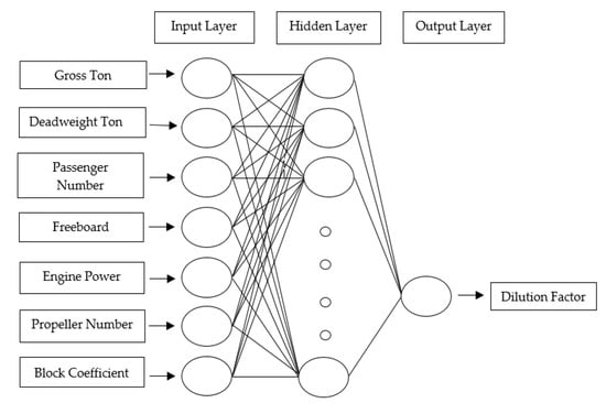 Since the inputs—gross ton, deadweight ton and passenger number—used in the ANN are directly related to the weight of the ship, load and passenger carrying capacity and the amount of waste water to be produced, these parameters have an effect on the dilution factor. On the other hand, as the other inputs used, the freeboard and the block coefficient (CB) will be directly related to the wake that will occur behind the ship, while the engine power and the number of propellers are related to the turbulence and mixing event that will occur behind the ship, and therefore it is related to the dilution factor, too.