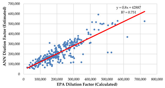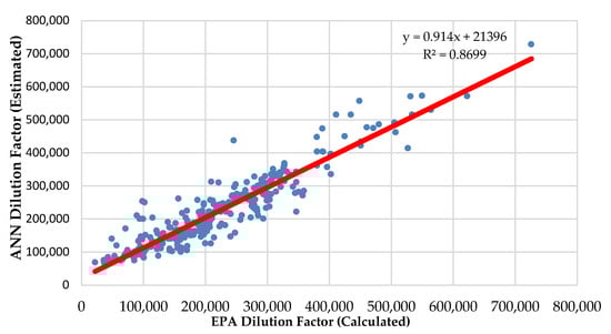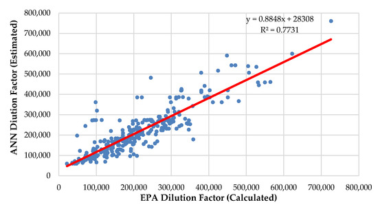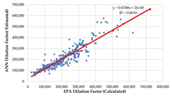 Figure 6 shows the relationship between the dilution factors in which ANN is trained only with the GT data series and the dilution factor calculated by the EPA formula.