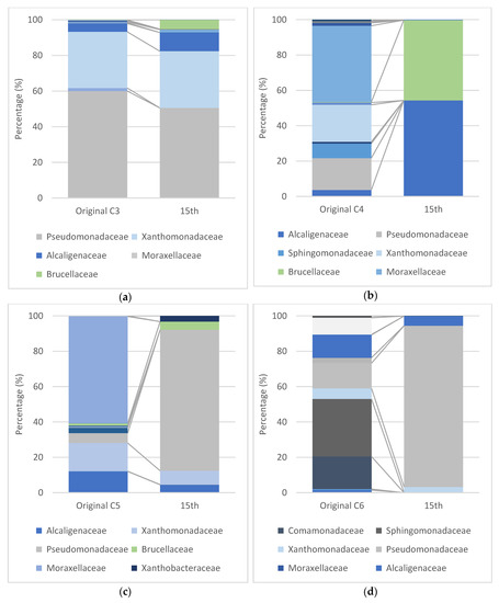 NGS profile of the consortia (a) C3, (b) C4, and (c) C5 enriched from WWTP near the beach; and (d) C6 from an oil refinery company. The predominant family was Pseudomonadeceae, Xanthomonadaceae, Alcaligenaceae, Moxarelaceae, and Brucellaceae.