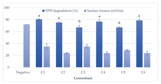 Percentage of TPH degradation and surface tension reduction by the 15th generation of six consortia (After 15 days of incubation at 30 °C and 140 rpm).