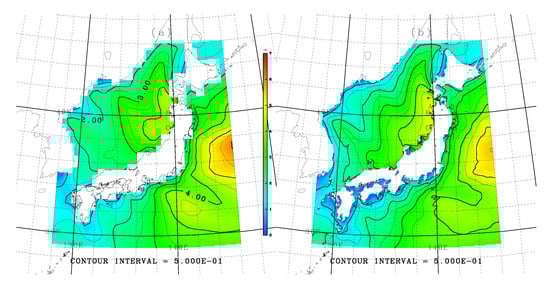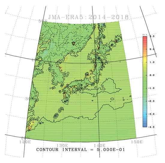 Figure 10 shows the differences of mean ERA5 wind speeds and mean JMA wind speeds from 2014 to 2018 ( − ). The differences of mean wind speeds ( − ) at the GPS buoy positions range from about m/s to m/s The mean wind speeds are < at five buoy positions out of 10 buoy positions. The difference of the local wind speeds cannot explain the result that < in all of the buoy positions.