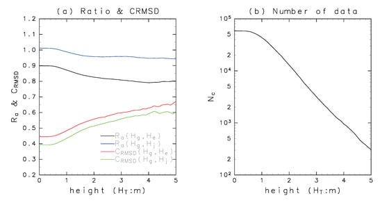 (a) Ratios of mean wave heights () and the centered RMSD (CRMSD) () as a function of and (b) the number of data for comparison, which satisfies . (a) Black: (Equation (2)). Blue: . Red: (Equation (6)). Green: . The period of the comparison is from 2014 to 2018.