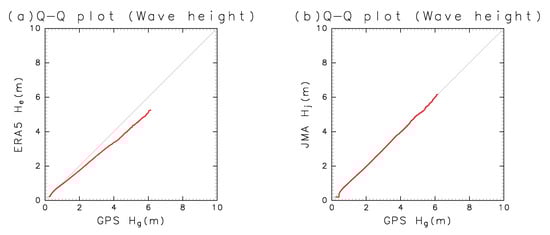 Figure 5 shows the Q-Q (quantile-quantile) plots between and and between and . The ERA5 wave heights are underestimated in higher wave conditions, while the JMA wave heights are not underestimated.