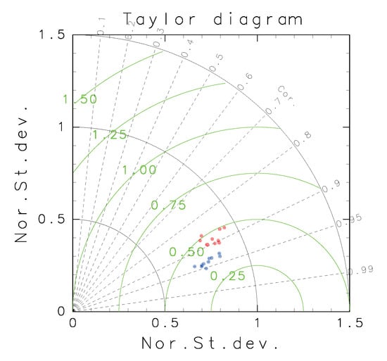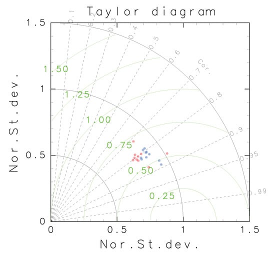 where X and Y denote the observed and computed values and denotes averaging. The skill metric is the root mean squared difference (RMSD); is the correlation coefficient; SI is the scatter index; is the normalized centered RMSD (CRMSD); and is the normalized standard deviation (NSD). The closer is to 1, the closer is to 0, and the closer is to 1, the higher the accuracy of Y. The SI is defined as the ratio of the standard deviation of the differences to the mean observed value. The CRMSD and NSD are normalized by the observations, and it is possible to compare across different data groups. The closer SI is to 0, the closer CRMSD is to 0, and the closer NSD is to 1, the higher the accuracy of Y.