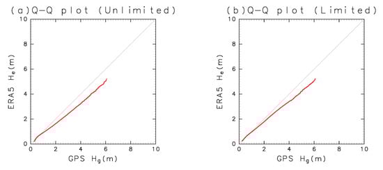 Figure 7 shows the Q-Q plots between and in the fetch-limited condition and the fetch-unlimited condition. The ERA5 wave heights are underestimated as the wave height increases in both cases. Although the ratio is larger in the fetch-limited condition than in the fetch-unlimited condition, the ERA5 wave heights in the fetch-limited condition are also underestimated in high wave conditions.