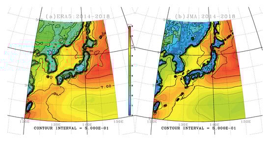 Figure 9 shows the mean ERA5 wind speeds and mean JMA wind speeds from 2014 to 2018. Figure 9a and Figure 9b are similar to each other. The wind speeds at the GPS buoy positions range from about 5 m/s to 7 m/s.