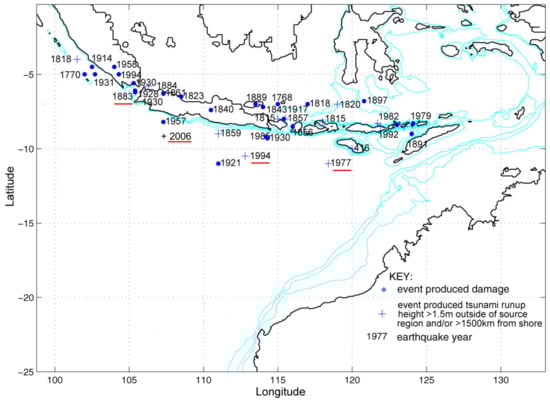 Location of earthquakes generating tsunami in the northwest of Australia (from Pattiaratchi and Woo [1]). The red underlined events created a tsunami that was recorded in Australia.