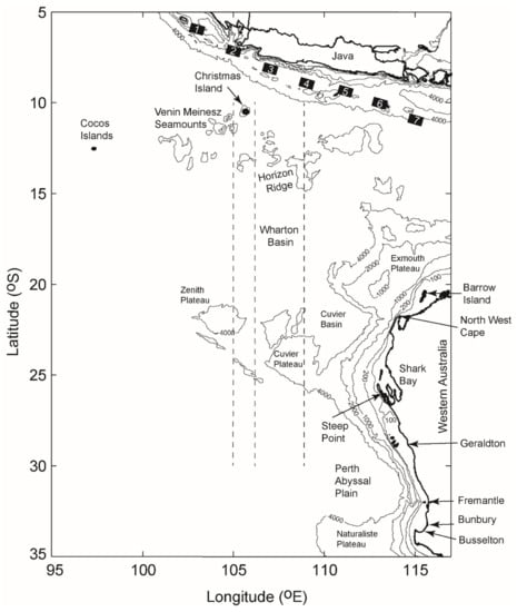 The aim of this study is to examine the role of surface and subsurface ocean topography that influence the propagation of tsunami waves to southwest Australia. In particular, the region between Geraldton and Busselton (Figure 2) where >90% of the West Australian (WA) population live is the focus. Studies have shown that in comparison to other regions of Australia, the WA coastline experiences a relatively high frequency of tsunami occurrence through the tsunamigenic earthquakes along the Sunda Arc, south of Indonesia [7,12]. Large tsunamigenic earthquakes offshore of Java and Sumba are likely to be a greater threat to WA than those offshore of Sumatra or elsewhere in Indonesia [7,12]. Many topographic features are located between the Sunda Arc and southwest Australia that could influence tsunami wave propagation and include (Figure 2): Christmas Island, Venin Meinesz Seamounts, Horizon Ridge and several plateaus (Zenith, Cuvier, Exmouth).