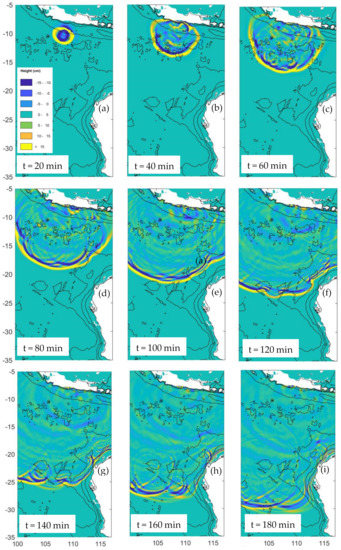 The time series of tsunami wave propagation from the tsunamigenic earthquake scenario four highlights the influence of ocean topography (Figure 3). Twenty minutes after the earthquake the leading crest of the tsunami wave was symmetric and approaching the Venin Meinesz Seamounts (Figure 3a). After 40 min, the leading crest of the tsunami wave had passed Christmas Island, Venin Meinesz Seamounts and the Horizon Ridge and had made landfall in Java (Figure 3b). At 60 min, the leading waves had progressed to the Wharton Basin with many local oscillations present in the region of seamounts (Figure 3c). Over the period of 80 to 120 min, the wave transited across Wharton Basin and approached the three main plateaus (Figure 2): Zenith, Cuvier and Exmouth (Figure 3d–f). The Exmouth Plateau slowed the propagation due to reduced depth (Figure 3f). The interaction between the tsunami waves with Zenith and Cuvier Plateaus occurred between 100 and 120 min with the propagation speed of the wave crest decreasing over the summits of the plateau. This was noticeable as the wave propagated over the deeper water between the Zenith and Cuvier Plateaus; the wave crest is advanced to the south compared to that over the plateaus (Figure 3f). At 140 min, the tsunami waves had made landfall at North West Cape (Figure 2) on the Australian mainland (Figure 3g). Along 25° S, the single tsunami wave crest had decomposed to three separate crests downstream of the plateaus (c.f. Figure 3d,g) and secondary wave crests were visible downstream of the plateaus (Figure 3g). Over the subsequent 40 min, the waves propagated southward but with two clear leading wave crests (Figure 3h,i).