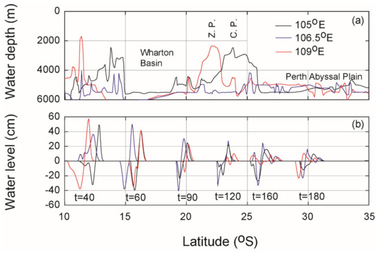 (a) Bathymetry cross-sections in the north–south direction at 105° E, 106.5° E and 109° E representing sections across Zenith Plateau (red lines), bathymetric trough (blue lines) and Cuvier Plateau (black lines), respectively; (b) leading tsunami wave profiles from tsunamigenic earthquake scenario 4 at different elapsed time (in minutes) after the earthquake. The locations of the cross-sections are shown in Figure 2. Note that only the leading waves of the tsunami are shown.