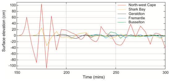 The time series of surface elevation along the 100 m contour offshore at five different locations along the coastline was extracted from the model output for the tsunamigenic earthquake 4 scenario. This is the centre point of the seven scenarios and was located close to the 2006 tsunami (Figure 1 and Figure 2). Note that for scenarios located to the east (6, 7), the Australian continental landmass acts as a shelter to locations south of Shark Bay (Figure 2). The results for scenario 4 indicated significant spatial changes in the tsunami wave heights along the coast (Figure 5). Maximum wave heights (>210 cm) were predicted at North West Cape due to the proximity of the location to the earthquake source and due to focusing from Exmouth Plateau (Figure 2)—this is discussed below. The maximum wave height at Shark Bay was ~56 cm whilst it was 12 cm at Geraldton and Fremantle. A slightly higher maximum wave height (17 cm) was predicted at Busselton (Figure 5).