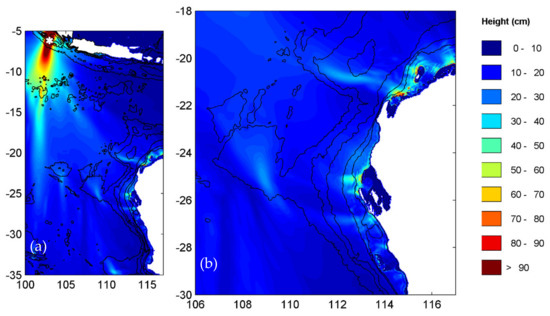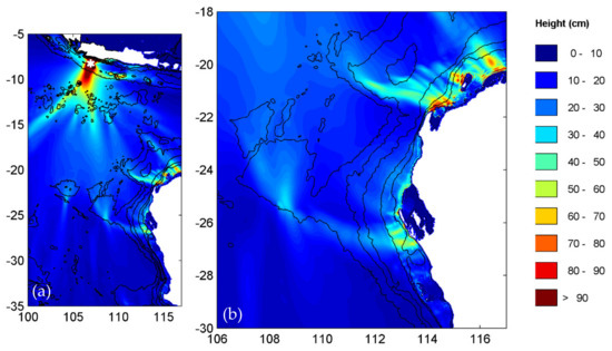 Maximum tsunami wave heights for tsunamigenic earthquake scenario 6. (a) Whole model domain and, (b) a zoomed version around northwest Australia.