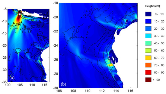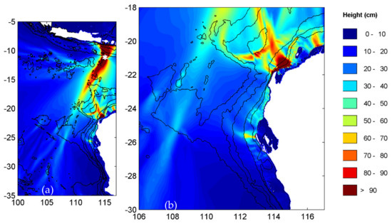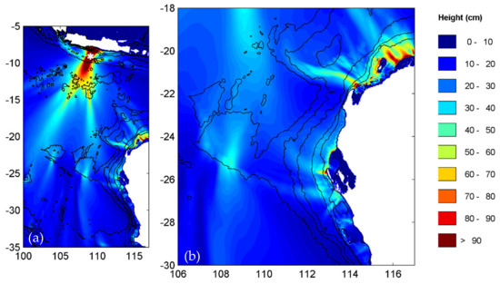 Scenario 4 was close to the location of the Pangandaran earthquake (Mw 7.7) and tsunami that occurred on 17 July 2006 [2,10]. There were two major beams (Figure 9a) with the eastern beam interacting with Cuvier and Exmouth Plateaus to create increased wave heights at Barrow Island, North West Cape and Shark Bay (Figure 9b), similar to scenario 3. The highest wave heights for the Shark Bay region were predicted from this scenario (see also Section 5).