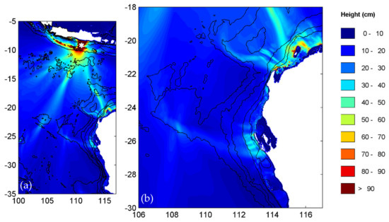 Maximum tsunami wave heights for tsunamigenic earthquake scenario 7. (a) Whole model domain and, (b) a zoomed version around northwest Australia.
