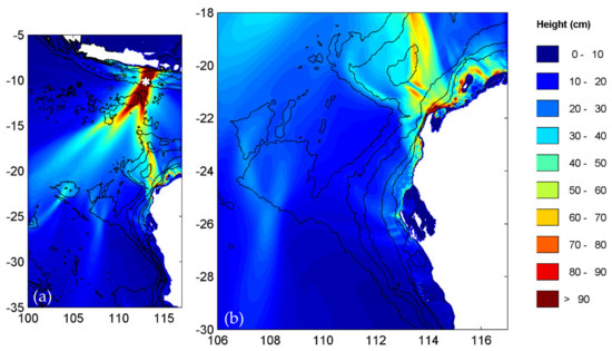 For this study, the MOST (Method of Splitting Tsunami) model [17,18,19,20] was used. MOST is a suite of numerical simulation codes capable of simulating three processes of tsunami evolution: earthquake, transoceanic propagation and inundation of dry land. As the aim of this paper is to examine the role of offshore topography on tsunami wave propagation, the inundation of dry land was not implemented. The tsunami generation model assumes a fault plane model of the earthquake source based on an elastic half-space overlaid with an incompressible liquid layer representing the earth’s crust and ocean, respectively [20]. Linear models are used to study the generation process of the model because the gravity wave formation due to the initial water disturbance is generally a slow process driven by hydrostatic forces with negligible non-linear effects [21]. The propagation algorithm of the model is extremely flexible and can simulate tsunami movement over basin scales. The MOST model has been validated and verified substantially through analytical solutions, experimental results and field measurements as outlined in Synolakis et al. [22,23]. The MOST model is implemented in the ComMIT model [24] but in this study, the original code was used.