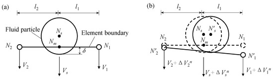 The contact treatment of fluid and structure is shown in Figure 1, where N1 and N2 are two finite element nodes, and the fluid particle Ns is regarded as a sphere with a radius of half of the particle spacing. Before the fluid particles come into contact with the structural nodes, the corresponding velocities of Ns, N1, and N2 are Vs, V1, and V2 respectively, while l1 and l2 are the distances from the center of Ns to N1 and N2, respectively. The cross-over distance from fluid particle to structure element is δ, which can be calculated based on the distance from particle center to element boundary and particle radius, as shown in Figure 1a. In order to eliminate interpenetration, the velocity of the fluid particle and structure element node is adjusted through iterative processing of the conservation of momentum and principle of equal velocity at contact points. For instance, during the n-step iteration after the contact between the fluid particle and the structural element, the speed of the corresponding points becomes Vs + ΔVsn, V1 + ΔV1n, and V2 + ΔV2n, and the positions become N’s, N’1, and N’2, respectively. After the elimination of penetration, the contact point between the fluid and the structure unit is set to Nm, as shown in Figure 1b. The velocity increments ΔVsn, ΔV1n, and ΔV2n are calculated by the following equations: