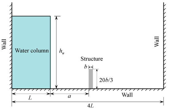The initial setup of the numerical model is shown as Figure 2, where hu and L are the height and the width of water column, respectively; b is the width of structure, and the height of structure is 20b/3; and a is the distance between water column and structure. At the initial stage, the water column is located on the left side of the fixed wall of the rectangular tank with a length of 4 L and keeps a static equilibrium state. The bottom of the structure is consolidated with the tank. The water column is released at the time of t = 0 to collapse under the action of gravity, generating a dam break wave impacting the structure.