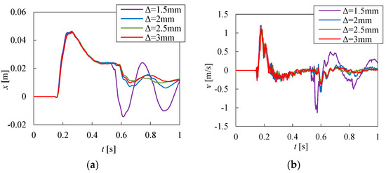 Figure 3 presents the computed horizontal displacement x and velocity v at the top of the structure using different particle spacings. It can be seen that the maximum displacement and velocity of the structure occur at t = 0.25 s and t = 0.187 s, respectively. A comparison of the results with different initial particle numbers shows that the displacement and velocity of the structure are generally same when t < 0.5 s, whereas the computed results are clearly different when t > 0.5 s. When Δ = 2.0 mm~3.0 mm, the computed results tend to be overlapped. However, for the case of Δ = 1.5 mm, the time histories of displacement and velocity fluctuate greatly, and the free surface profile of fluid with Δ = 1.5 mm is quite different from those with Δ = 2.0~3.0 mm. Figure 4 shows the free surface shape of the fluid and the induced deformation of the structure and at the moment of t = 0.62 s. It is observed that, when Δ = 1.5 mm (i.e., small particle spacing and large number of particles), water splash is more obvious. For this case, there are too many particles in the support domain of the kernel function, which causes the viscosity of the fluid to decrease and the shear modulus is correspondingly decreased, hence the computed free surface deformation is too large. This is consistent with previous relevant studies that the smaller particle spacing leads to the smaller stiffness and the larger deformation [34]. Combining the numerical accuracy and calculation efficiency, the particle spacing of Δ = 2.5 mm is selected for the subsequent simulation.
