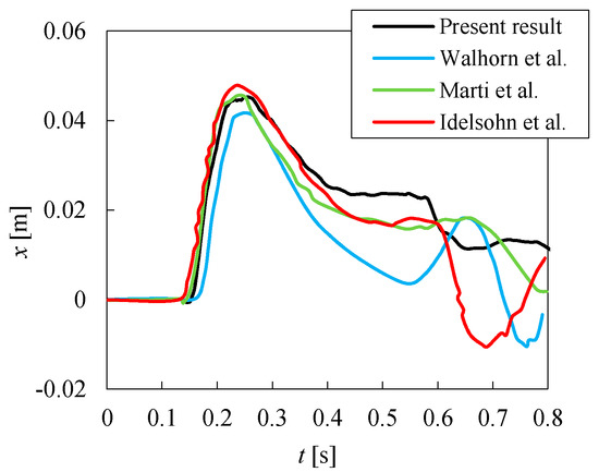In addition, the time history of the displacement of the upper left corner of the structure is also compared with other available numerical results [5,6,7] and is illustrated in Figure 6. It can be seen that, in the early stage of the simulation, the results calculated by the present SPH-FE method are consistent with the results in the literature. The peak value of the displacement as well as the corresponding time fit well with the other results. It is worth noting that some differences are found for the different method at the later stage owing to the complex free surface fusion process. However, the present study is mainly focused on the arrival time of waves and the peak displacement of the structure during the early stage. Hence, the SPH-FE method adopted here is feasible for the present study. To further validate the present model, the additional comparison with classical dam-break case by experiment is included in the Appendix A.