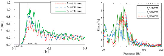 Figure 7 presents the horizontal displacements at the upper left corner of the elastic structure for different water column height. It illustrates that water waves reach the structure at t = 0.138 s under different water column heights. The influence of water column height on the arrival time of water wave is not noticeable. When t = 0.186 s, the displacement of the structure reaches the peak value, and the response duration of the structure from the beginning of movement to the peak value is very short (i.e., 0.048 s). The peak value of the displacement is expected to increase with the increase of the water column height. The displacement amplitude of the structure decreases rapidly with time and decays to approximately 30% of the peak value after t = 0.3 s. Additionally, it can be seen from the curve shape that the displacement of the structure exhibits the characteristics of simple harmonic vibration under the impact of the fluid, and the attenuation of residual vibration is slow. In order to assess the periodicity and verify the appearance of super-harmonics of the structure vibration, the spectral analysis was also conducted using fast Fourier transformation (FFT) of time-series data. The corresponding results are plotted at the right of Figure 7. As can be seen, the peak frequency for all the cases is approximately within the range of 40–50 Hz, which is related to the natural frequency of the structure.