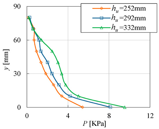 Figure 8 shows the vertical distribution of the extreme pressure P on the structure. The maximum wave pressure appears at the bottom of the structure regardless of the water column height. The peak pressure along the wave front of the whole structure increases with the increase of the water column height, which is reasonable because the higher water column with larger potential energy will result in larger wave load on the structure. The large pressure is confined near the bottom of the structure (y < 10 mm), which indicates that the bottom of the structure is greatly impacted by the water wave. The reason is that the collapsed water wave first arrives at the bottom part of the structure with large energy; subsequently, the water climbs on the structure with water splashing and energy dissipation. Hence, the wave-induced pressure on the bottom is comparatively larger owing to stronger water particle impacting on the bottom of the structure.
