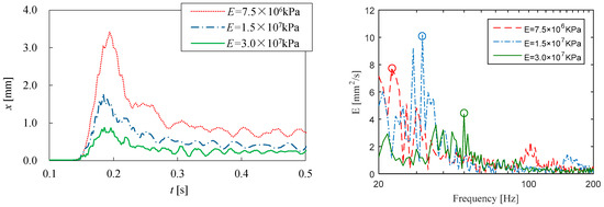 The displacement at the top of the structure with different Young’s modulus E is plotted in Figure 11. With the decrease of the structure stiffness (i.e., increasing the value of Young’s modulus), the starting time for the structure movement remains almost the same, whereas the time corresponding to the peak value of the displacement is delayed, which indicates that the response time of the structure increases. The amplitude of displacement increases with the decrease of the structure stiffness, as expected. The frequency spectrum analysis illustrates that the peak frequency increases with the increase of structural stiffness, as can be seen from the circle plotted in the figure. Overall, the effect of structure stiffness on the dynamic response of structure is significant, including both the displacement and the frequency of the vibration, and this phenomenon is reasonably reproduced by the present numerical modeling.
