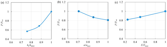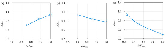 In this section, the influence of the above-mentioned parameters (i.e., the height of the water column hu, the distance between the water column and the structure a, and the Young’s modulus E) on the structure displacement x and pressure Pb is comprehensively analyzed, as illustrated in Figure 13 and Figure 14, respectively. In the figures, the variable is normalized by its maximum value. Figure 13 indicates that x/xmax is increased with increasing hu/humax, but decreased with increasing a/amax and E/Emax. Figure 14 shows that P/Pmax is increased with increasing hu/humax and E/Emax, but decreased with increasing a/amax. The reason has been mentioned above, that is, the higher water column means more potential energy of the water, and thus the hydrodynamic force impacting the structure is comparatively larger, inducing larger deformation of structure. The effect of a is mainly reflected from the energy diffusion during the collapsed water wave propagating to the structure, that is, a longer distance means more energy diffusion and relatively less kinetic energy acting on the structure, and the resultant smaller hydrodynamic force and structural displacement. Smaller stiffness implies that the structure deformation will be larger subjected to the same external force. Whereas the structure deformation in turn affects the hydrodynamic load on the structure, because this is an interaction process. The structure with larger deformation absorbs more fluid momentum and transforms it into structure deformation, thus its hydrodynamic load is relatively smaller.
