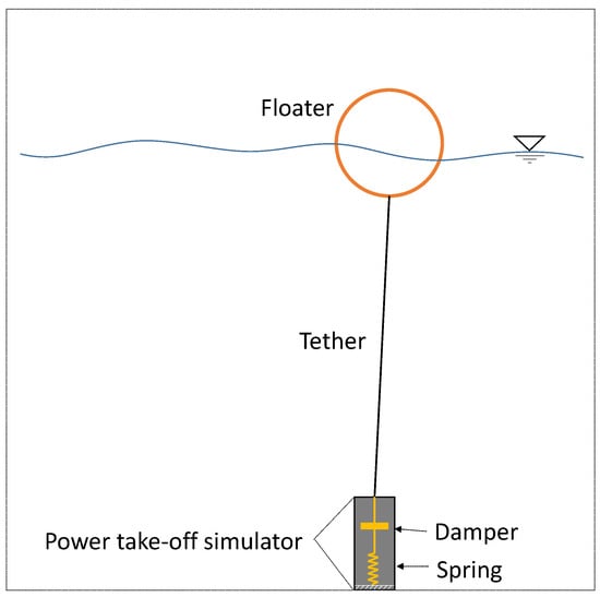 An idealized point absorber WEC was studied with numerical models and through experimental campaigns at the Department of Naval, Ocean and Marine Engineering of the University of Strathclyde [26]. During experiments, a closed control loop type of PTO simulator was used. The theoretical point absorber device, illustrated in Figure 4, is composed by a spherical floater, a tether mooring line (pre-tensioned) and a PTO system, which can be represented by a spring and damper components.