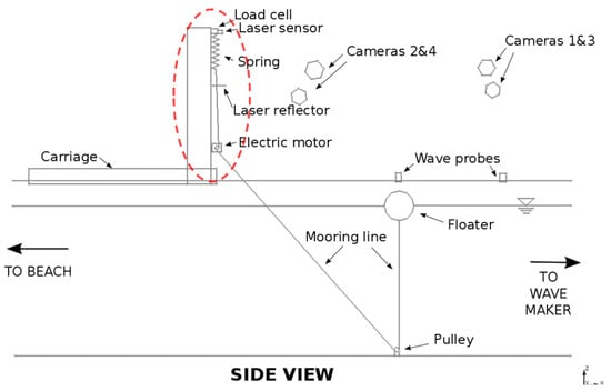 At phase 1, a geometrical scale ( within the range of can be adopted, e.g., [19,20,21]. At this stage, the main aim of the experimental work normally concerns a proof-of-concept, initial preliminary assessments on performances and numerical model validation. For such scales, rarely, a realistic PTO is implemented. In this case, a PTO simulator is normally used. This PTO simulator can be, for instance, an electric motor working as an active damper with a feedback control loop, mechanical breaks or hydraulic dampers.