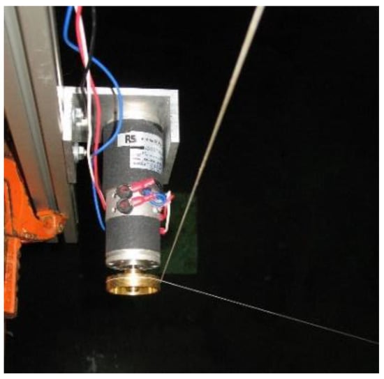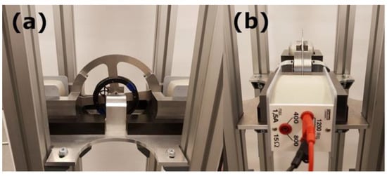 The rotatory PTO consists of a rotating aluminium disk mounted between two electromagnets that apply eddy current damping to the PTO. The magnetic field of the electromagnets is controlled by applying coil current in the range 0.2–1.4 A and the number of turns equal to 1200 for each coil. The motion of the buoy and line induces the rotational motion of the disk. During calibration procedures, clockwise and counter-clockwise rotations drop-weights tests have been conducted using weights in the range 0.2–1.2 kg. With the purpose of simplification, the end stop effect is not included in the rotatory PTO. In this set-up, a plastic block stand can be used to minimize the flux dissipation to the structure and for concentrating the flux in the air gap, as shown in Figure 12. The rotatory PTO employs eddy current braking for its damping force. The rotation of the disk in the electromagnetic field by the coils forms the eddy current on the disk resulting in a repulsive force (Lorenz force) between the disk and the coil [34]. The Lorenz force corresponds to the induced eddy current and magnitude of the magnetic field. The induced eddy current on the disk is proportional to the disk tangential velocity and magnitude of the magnetic field. Hence, the eddy current damping brake force relates to the square of the coil current. Increasing the current to enforce the magnetic field is applicable and effective only before the saturation of the coil core.
