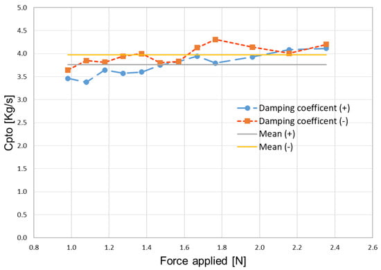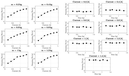 Figure 14 displays results of the damping for the rotatory PTO, where the damping coefficient rises by increasing the current and it reveals minor fluctuation with the mass of the weights. The maximum damping force attains 2.9 Ns/m in the scale model, which corresponds to a real scale value of 14.3 kNs/m. The converging increase of the pattern of the damping coefficient by the current to a constant value indicates the coil’s core saturation.