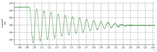 where is the mass, the PTO damping coefficient, the spring stiffness coefficient and is the vertical displacement. By using a laser sensor, linked to a data-logging computer, it was possible to digitalize precisely the motion. Figure 10 shows an example of oscillations during an oscillatory calibration test.