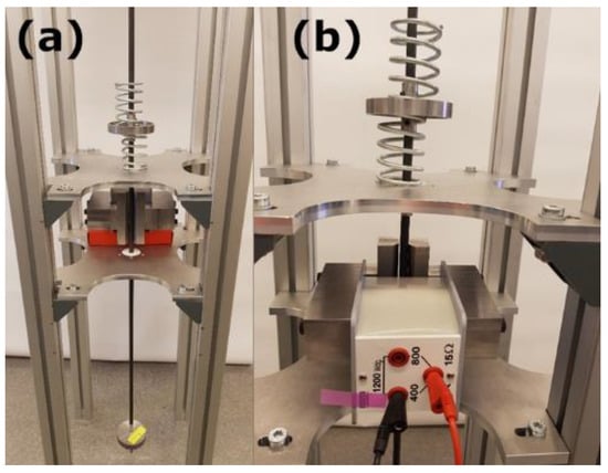 Similarly, in the linear PTO (Figure 13), the steel rod moves vertically in a magnetic field that is created by varying the coil current in the same range as rotatory PTO but with 800 turns coil. As for the rotatory PTO, variable weights are used; these are attached to the end of the rod for retraction as seen in Figure 13. For the linear PTO, the end stops effect is taken into consideration by two springs attached to the rod that confines the stroke displacement. A temporal magnet is formed in the rod due to the ferromagnetic properties of steel, i.e., resulting in non-permanent tension of the rod to one pole of the magnet (coil), which prompts pure damping force between the contact surface of the rod and one pole of the coil. A range of air gaps values was initially assessed for selecting the most suitable distance between the translating rod and the electromagnets (Figure 13b). This value allowed a wide range of desired damping forces. The linear PTO exerts a damping force, to the translatory motion of the buoy/line, which is proportional to the coil magnetic field.