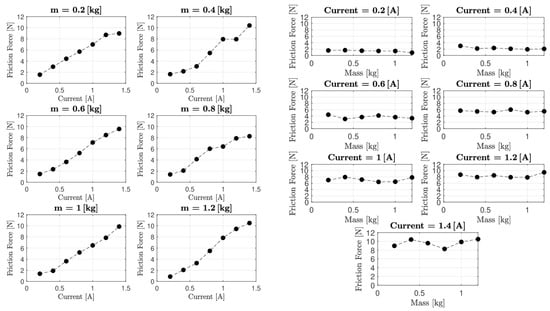 Results of linear PTO for 1:30 scale. To the right is the friction force versus the mass of the weight for different coil current. To the left is the damping versus current for a different mass of the weight.