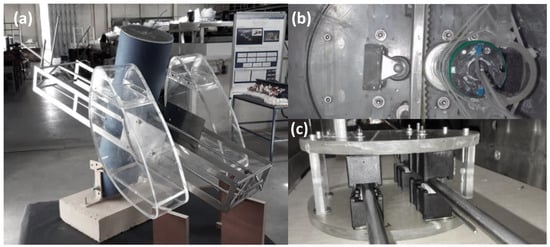 CECO wave energy converter: (a) 1:25 physical model, (b) rack-pinion system, (c) sliding frame fittings.