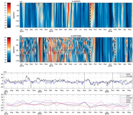 Figure 1. Daily zonal velocities from Acoustic Doppler Current Profiler (ADCP) (a) and Hybrid Coordinate Ocean Model (HYCOM) (b), the vertically averaged daily zonal velocities from ADCP and HYCOM (c), and monthly zonal velocities from ADCP, HYCOM, Simple Ocean Data Assimilation (SODA), and Ocean General Circulation Model for the Earth Simulator (OFES) (d) at the mooring site during the period of June 2014 to May 2016.