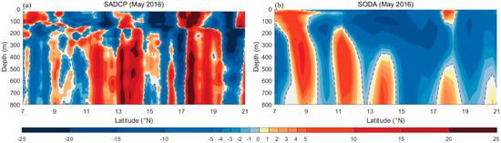 Figure 2. Zonal velocities from Shipboard Acoustic Doppler Current Profiler (SADCP) (a) and SODA (b) at 160° E section in May 2016.