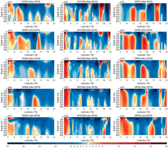 Figure 3. Monthly zonal velocities from SODA (a1e1), HYCOM (a2e2) and OFES (a3e3) at 160° E section during September 2015 to January 2016. Wrong HYCOM data from 1–15 September 2015 and from 16–31 January 2016 are removed.
